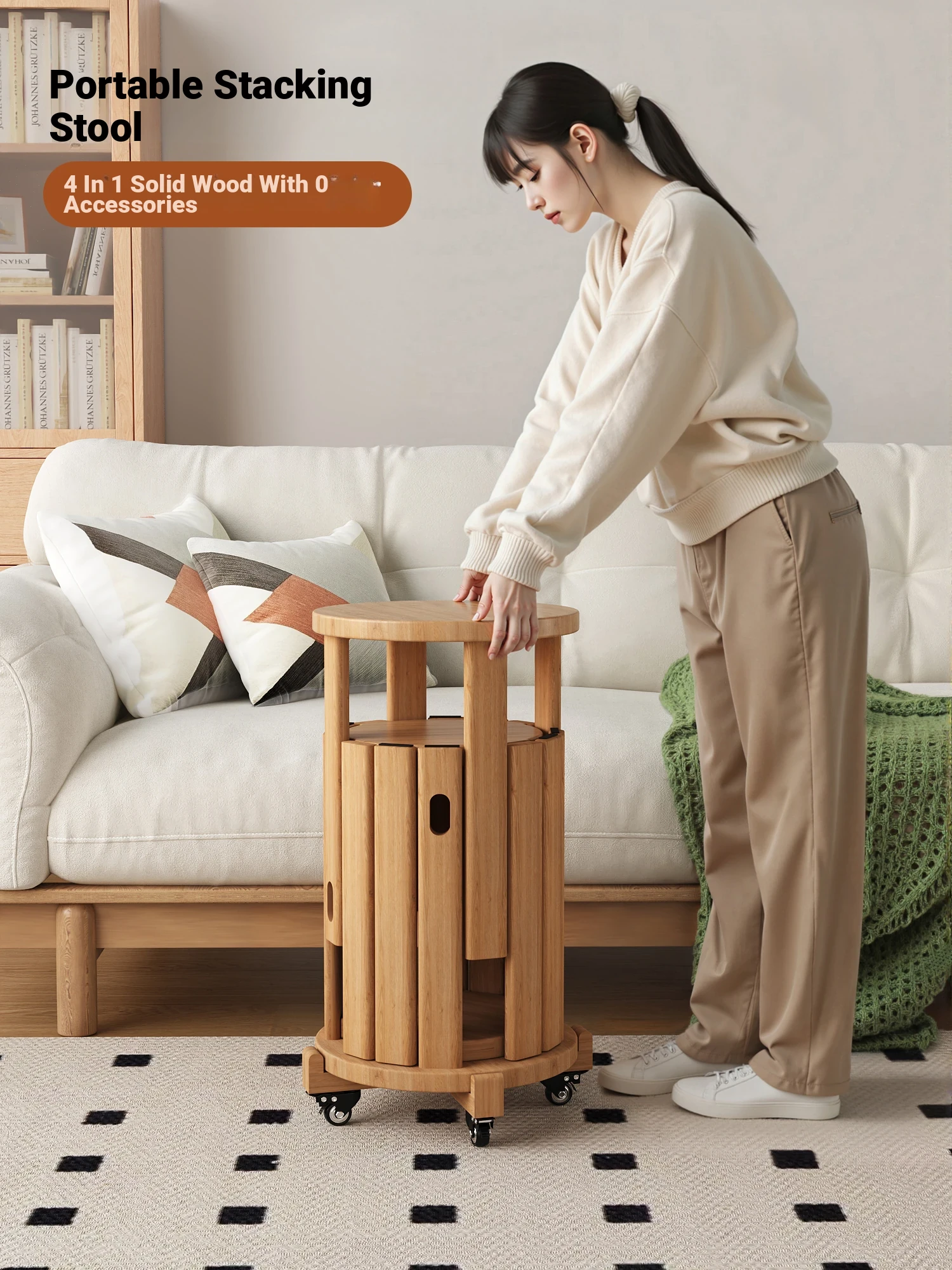 Versatile Solid Wood Stool with Wheels - Stackable and Space-Saving Round Seating for Home Use, Perfect for Storage and Easy Mobility, Natural Wood Finish