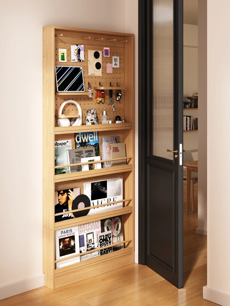 Slim Wall-Mounted Pegboard Storage Shelf - Versatile Narrow Cabinet for Snacks and Books, Multi-Tier Wooden Stand for Efficient Organization and Space-Saving Solutions.