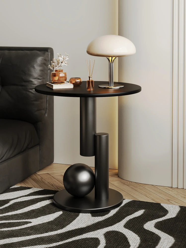 Elegant Black Side Table with Rock Slab Top - Stylish Minimalist Design for Living Room or Bedroom, Portable Small Round Coffee Table for Modern Homes