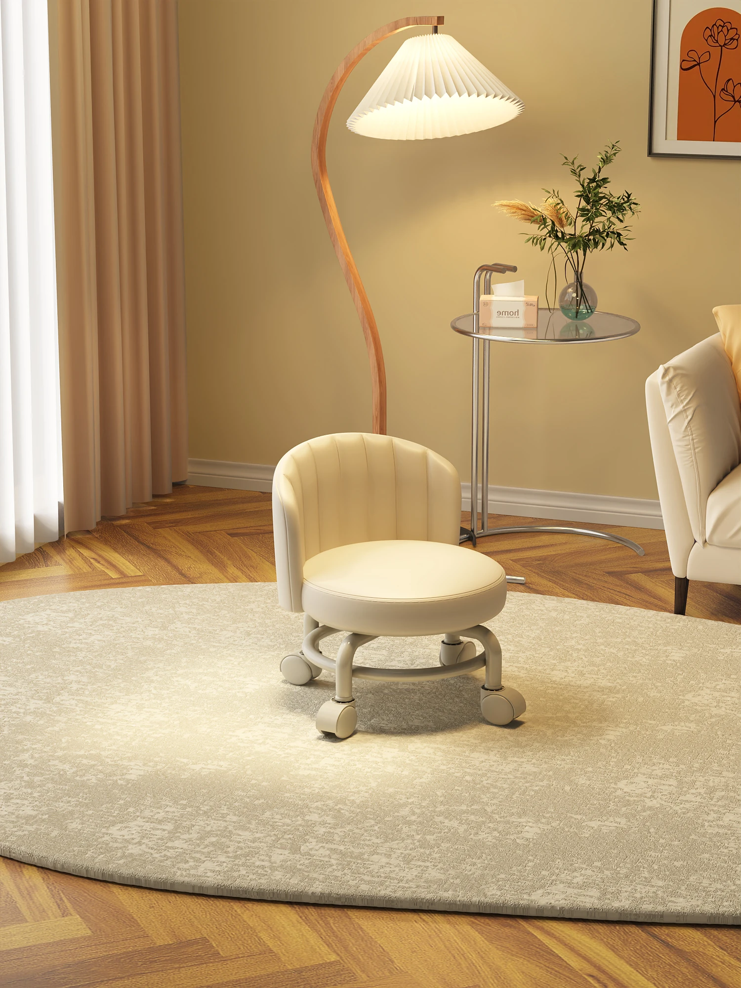 Feiwang Creamy Round Makeup Stool with Adjustable Height and Wheels - Stylish and Compact Dressing Table Chair for Home Use, Perfect for Girls' Bedrooms and Beauty Salons