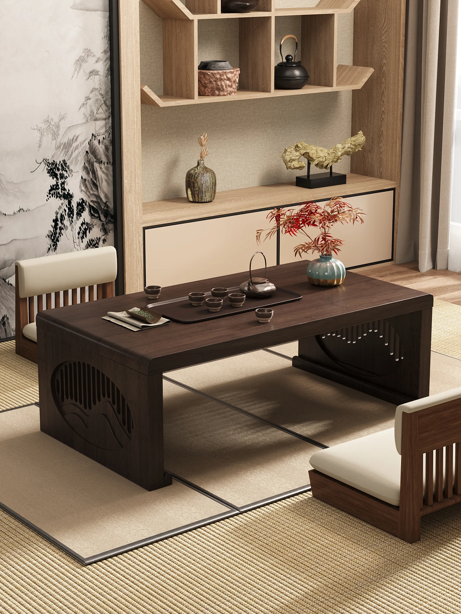 Folding Bay Window Table - New Chinese Style Tea Table for Tatami, Low Coffee Table for Home Use, Solid Wood Floor Seating Desk, Perfect for Cozy Gatherings