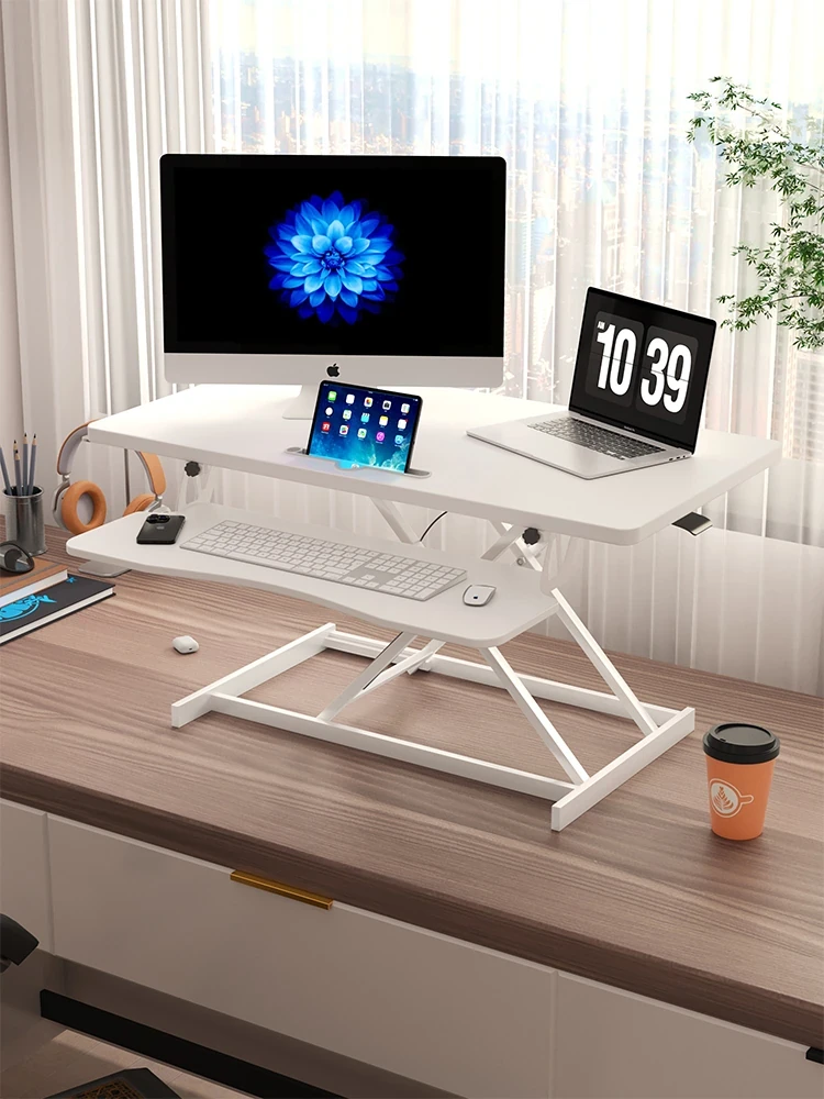 昇降式スタンディングデスク - 快適な仕事環境を実現!デュアルモニター対応、折りたたみ式のパソコンスタンド付きで、効率的な作業をサポート。立ちながら健康的に働こう!