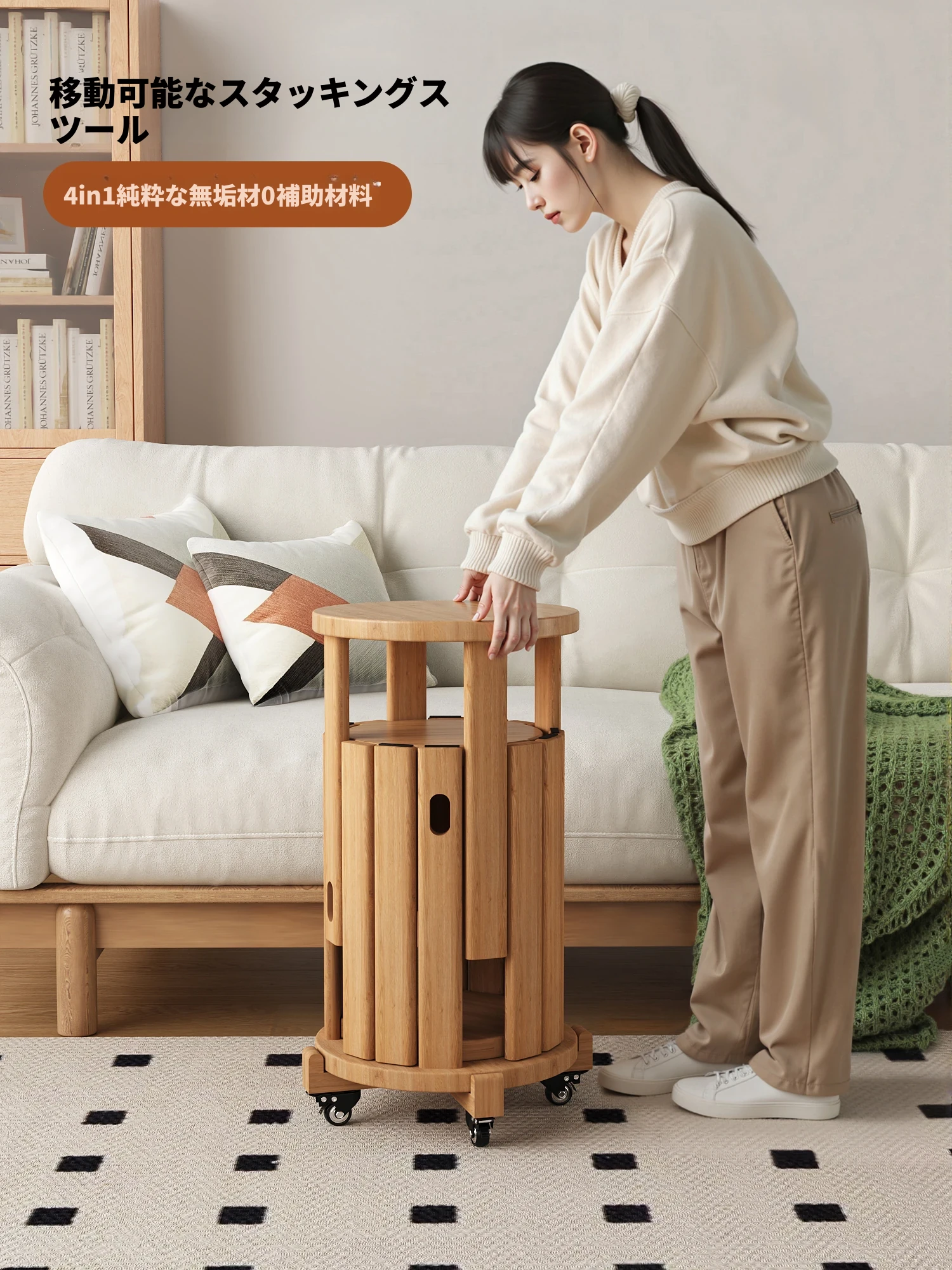 滑車付きで重ねて収納可能!天然木製のコンパクトスツール - おしゃれで実用的な家用スツール、空間を有効活用するサークル型デザインで、どんなインテリアにもぴったり。