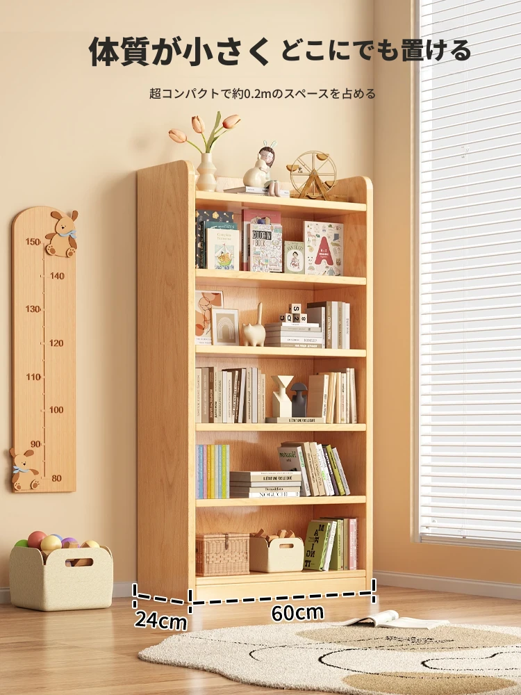子供向けの無垢材書棚 - スペースを取らない壁寄せ収納! 学生や家庭にぴったりのフロアスタンド型棚で、便利に本や小物を整理整頓。おしゃれで実用的な収納ソリューションをお届けします。